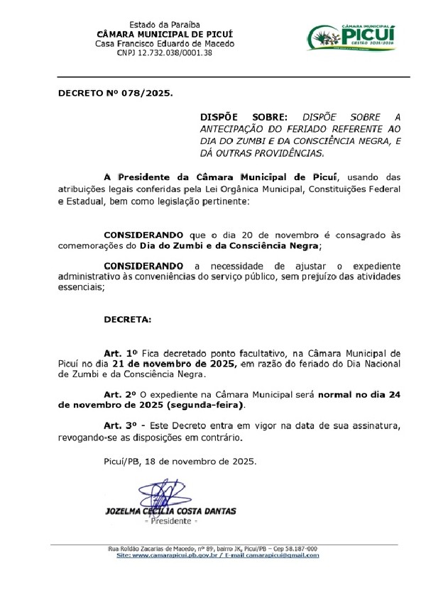 Em virtude do feriado nacional de quinta-feira (20), dia Nacional de Zumbi e da Consciência Negra, a presidente da Câmara Municipal de Picuí, vereadora Jozelma de Aguifá, decretou ponto facultativo no Poder Legislativo Picuiense, na sexta-feira (21), em virtude do feriado acima mencionado. O expediente voltará a normalidade na segunda-feira, 24 de novembro.